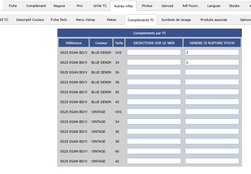 Vous disposez dans Fastmag dans la fiche produit Onglet Autres infos / Compléments TC du champ “VENDRE SI RUPTURE STOCK” pour chaque déclinaison