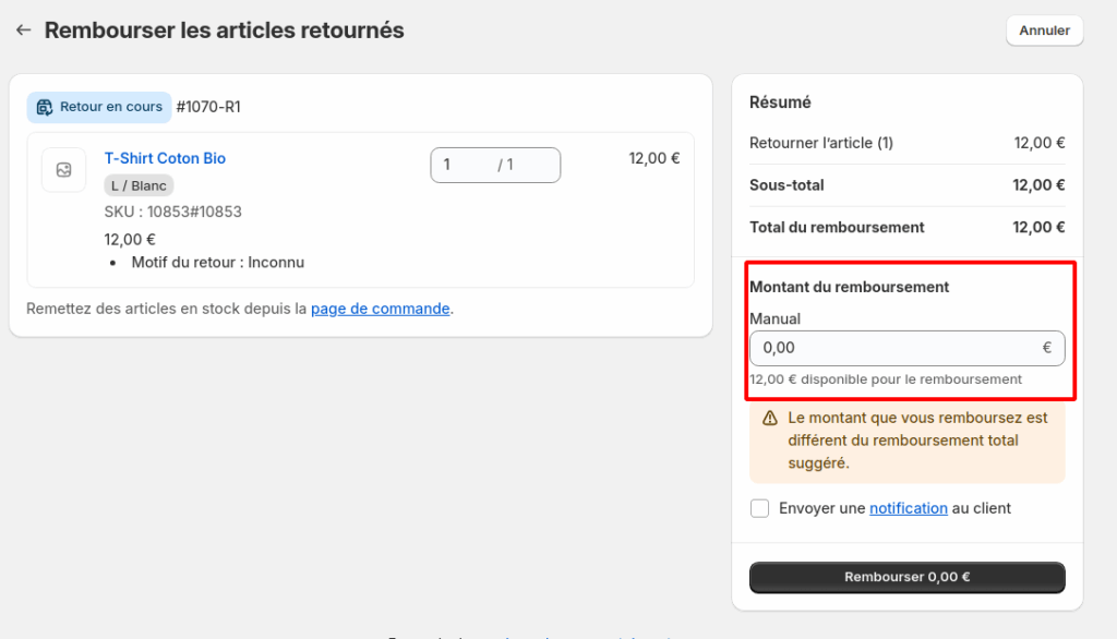 - Si une remise en stock est nécessaire, appuyez sur le bouton “Remettre en stock l’article” avant de confirmer le remboursement.
