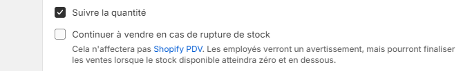 Afin de cocher automatiquement la checkbox Shopify “Continuer à vendre en cas de rupture de stock”, indiquez 1 dans le champ Fastmag “VENDRE SI RUPTURE STOCK” Si vous ne désirez plus vendre le produit Hors stock dans Shopify, vous devez indiquer 0 dans “VENDRE SI RUPTURE STOCK” ou vider la valeur.