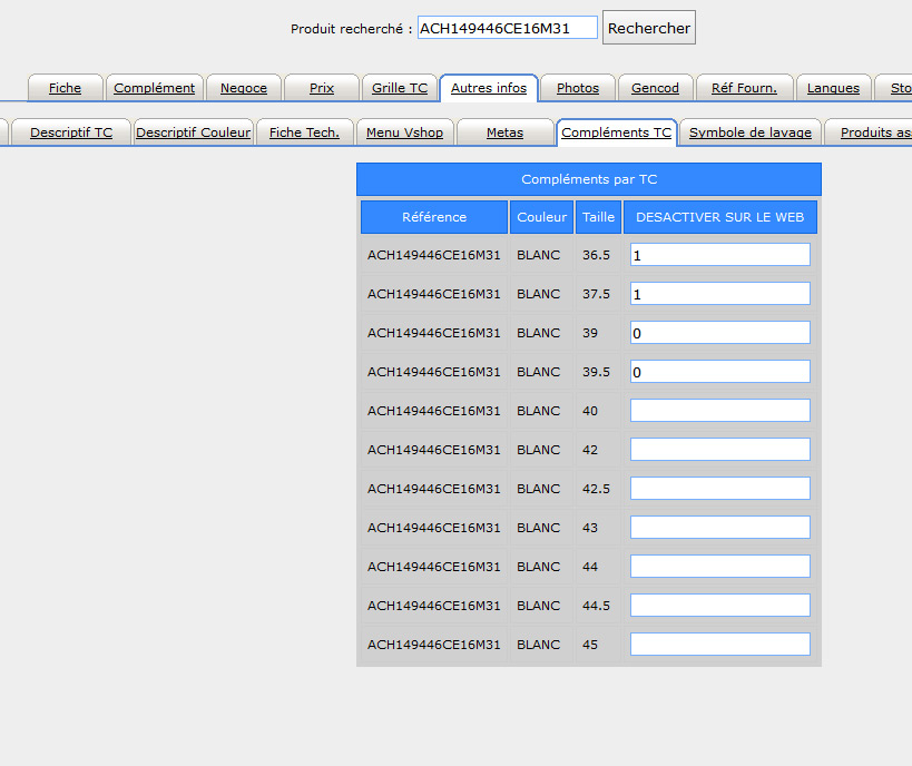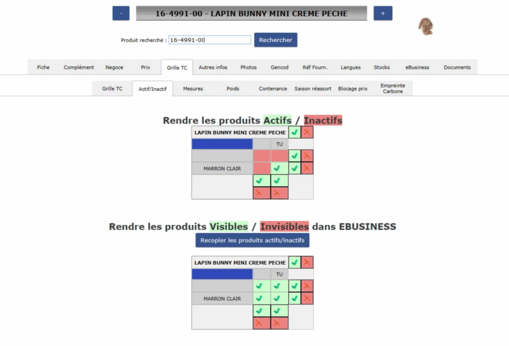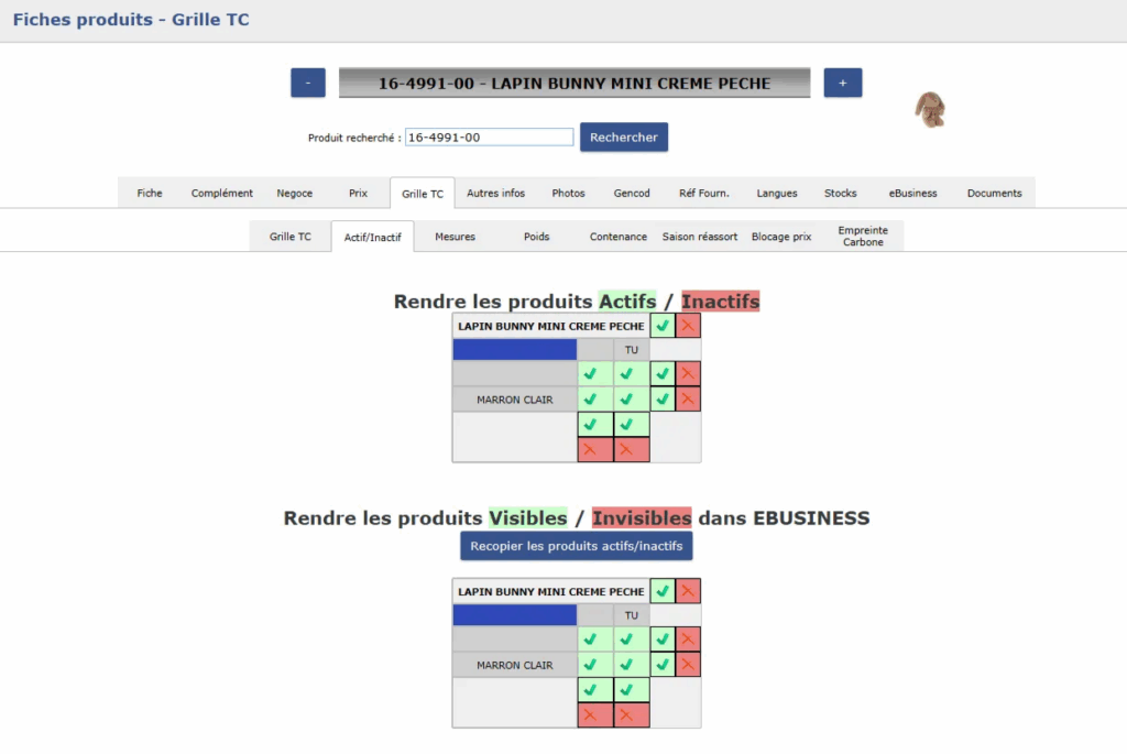 Si vous voulez totalement désactiver la déclinaison dans Fastmag, allez dans Grille TC – Actif / Inactif et cliquez sur les croix rouges dans "Rendre les produits Actifs / Inactifs” pour ne conserver que les tailles utiles / viables.