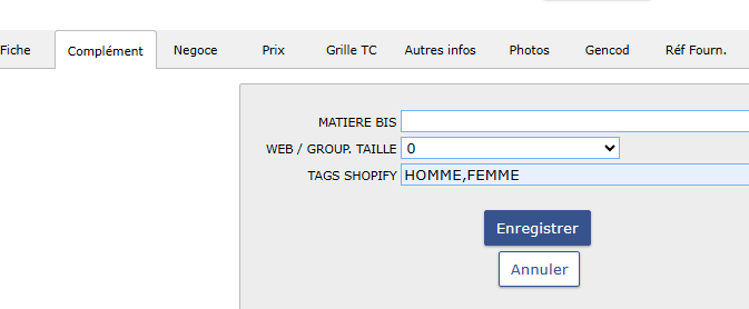 Vous avez la possibilité d’ajouter des tags sur la fiche produit de Shopify directement depuis le champ complémentaire TAG Shopify présent dans le complément de la fiche produit Fastmag. Ces tags viendront en complément des tags à synchroniser configurés dans notre application.
