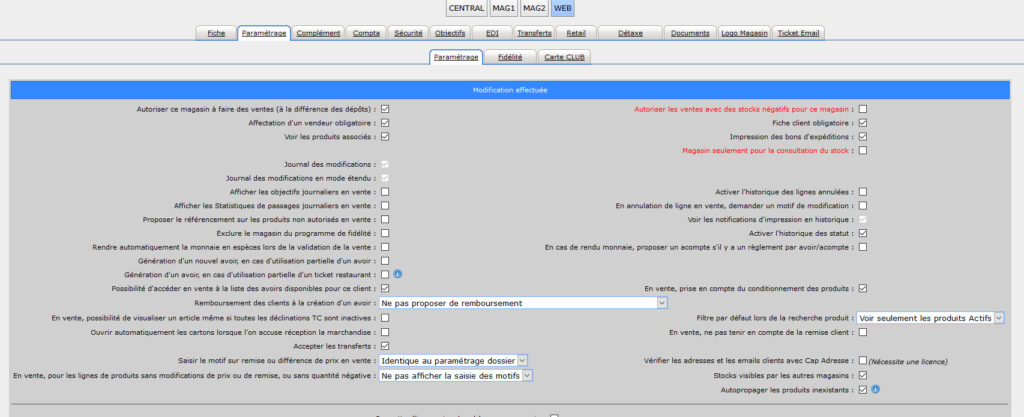 Si vous désirez autoriser les stocks négatifs, veuillez cocher la case “Autoriser les ventes avec des stocks négatifs pour ce magasin”.