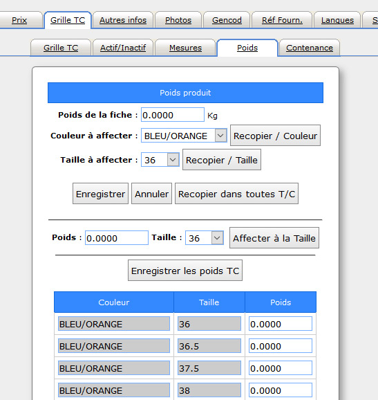 Dans Fastmag, vous pouvez définir le poids pour l’ensemble de vos produits ainsi que pour chacune des déclinaisons de vos produits. Pour réalisé cela :