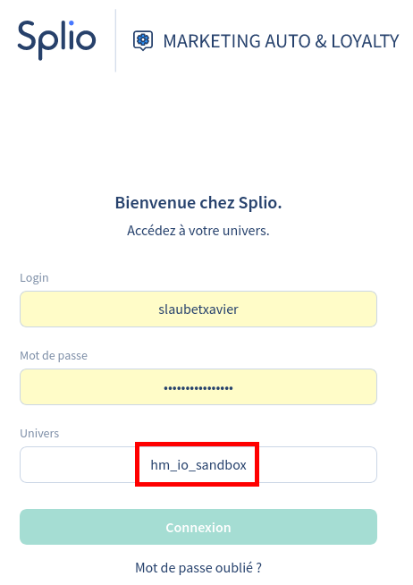 The Splio universe code is the third parameter to fill in the connection login in Splio admin: