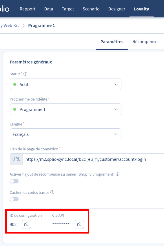 You can define here the ID and the API key of the Loyalty Web Kit configuration you want to use. To find them, go to Splio interface, menu Loyalty > Loyalty Web Kit, select the configuration you want to display, and copy the ID and the API key displayed in « General settings » fieldset.